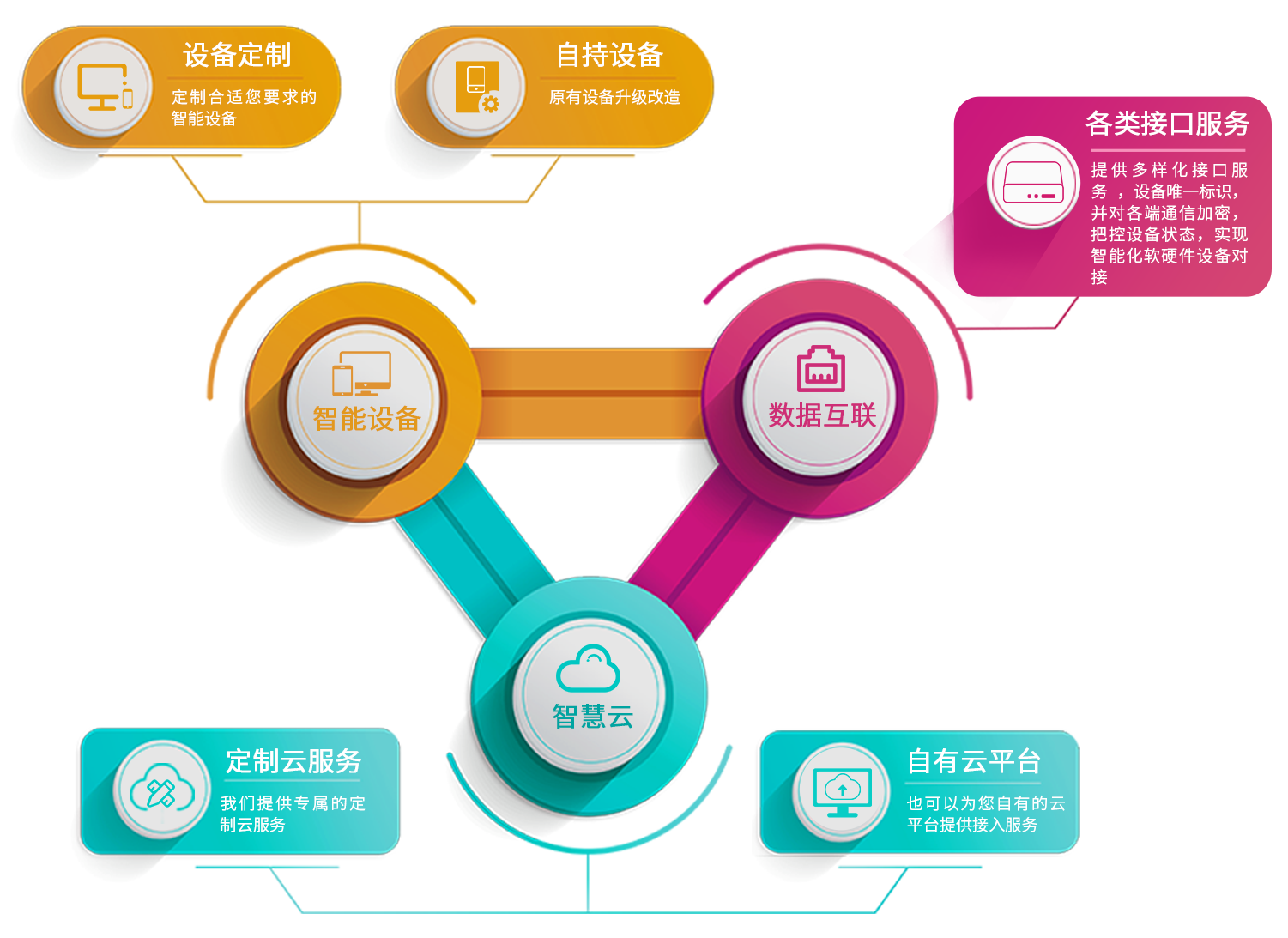 随着各行各业领域中“智慧”“智能”的相关产品不断的创新发展,逐渐产品与产品之间、产品与系统之间、系统与系统之间形成了一个个烟囱式的“信息孤岛”,产品之间的数据调用协作、系统之间彼此连通交互都不同程度的出现了阻碍和不兼容的情况。我们深挖软硬件产品研发方案和数据传输与业务应用的整体解决方案,不断在互联网、物联网、通信技术及云计算、大数据等热点信息处理上做技术研究,拓展解决方案可塑性,真正实现制造商、监管部门、用户等多方智能化互联,实现各种产品、各类系统跨行业的协作扩展能力,从而更好的为您打造专属的“互联网、物联网”生态圈。我们会继续坚持以产品智能聚焦行业市场,提供以技术服务、软硬件产品定制、数据对接服务、系统集成为核心的专属定制化服务,为您提供最适合您的专属集成解决方案。