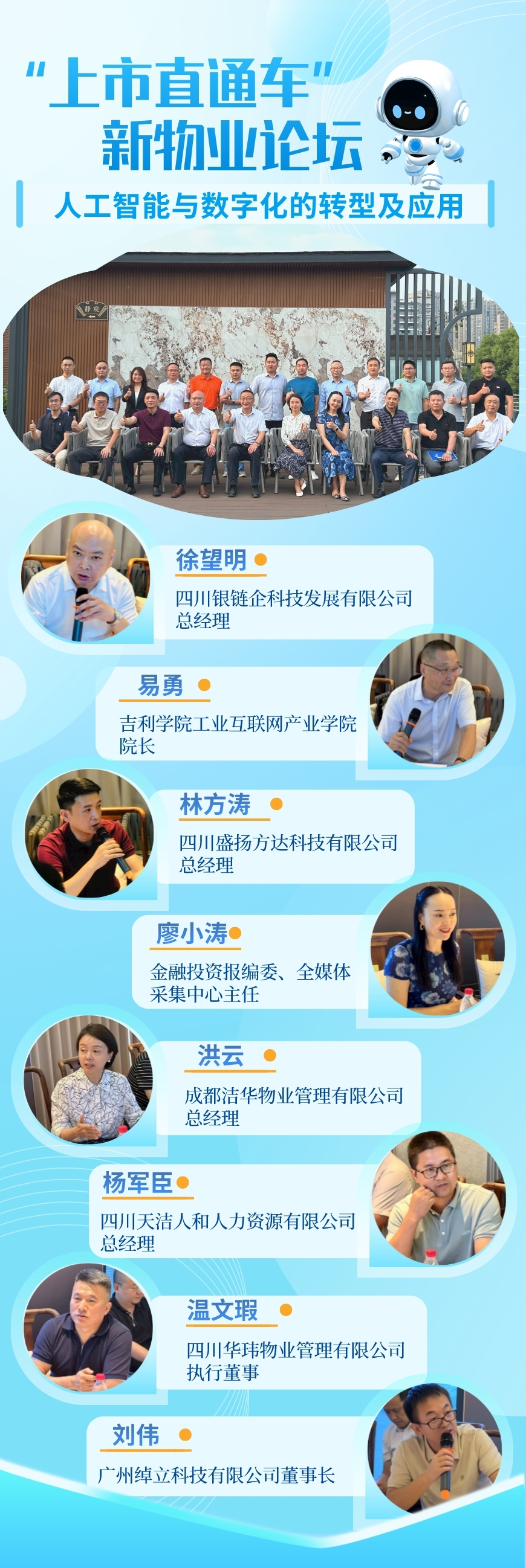 为推进健圈强链聚焦高质量发展主题主线,紧密围绕产业链部署创新链,促进企业间相互交流,推动物业服务企业创新发展,促进物业管理与智慧科技的融合,9月14日,由四川盛扬方达科技有限公司承办的“上市直通车”新物业论坛——人工智能与数字化的转型及应用活动顺利召开。本次活动邀请了成都市发改委经济体制改革智库成员企业、成都市物业管理协会及会员企业共计20余家物业公司高层代表参会。
