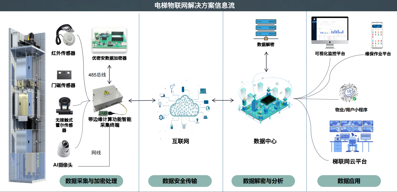 以数据采集、数据传输、数据分析、模型训练、孪生构建及应用交互共同构成了盛扬方达智慧电梯物联网系统。