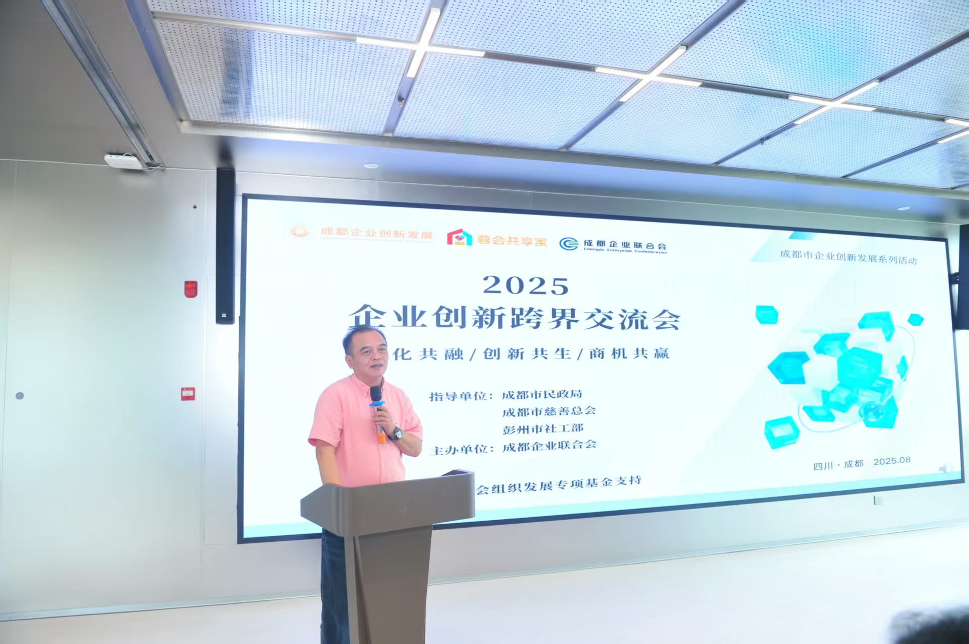 8月22日,以“文化共融、创新共生、商机共赢”为主题的2025企业创新跨界交流会在“天府金盆、牡丹故里”彭州圆满举办。作为成都企业联合会企业创新发展系列活动第四次路演核心环节,此次会议汇聚60余家政企代表,共商产业发展大计,四川大扶科技有限公司受邀参会,深度融入政企协同生态,见证“蓉会共享家”项目启动,为产业高质量发展注入科技动能。